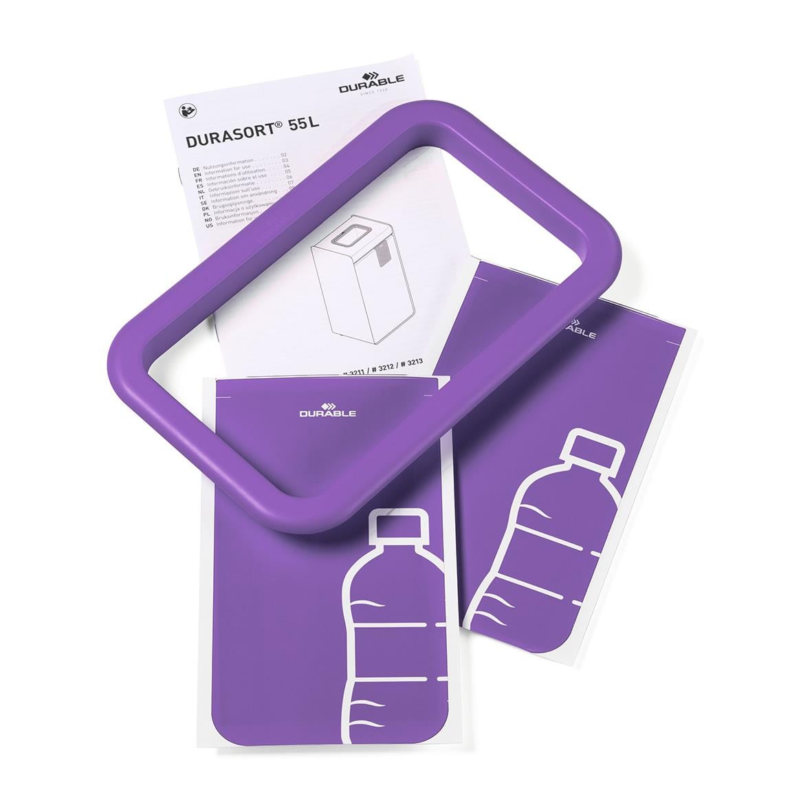 Genom att sortera avfall kan mycket material återvinnas, på så vis sparar vi energi och naturresurser. DURASORT 55L "plastförpackningar" är ett sopsorteringskärl som underlättar avfallssorteringen tack vare en lila ram runt inkastets öppning. Två lila kli