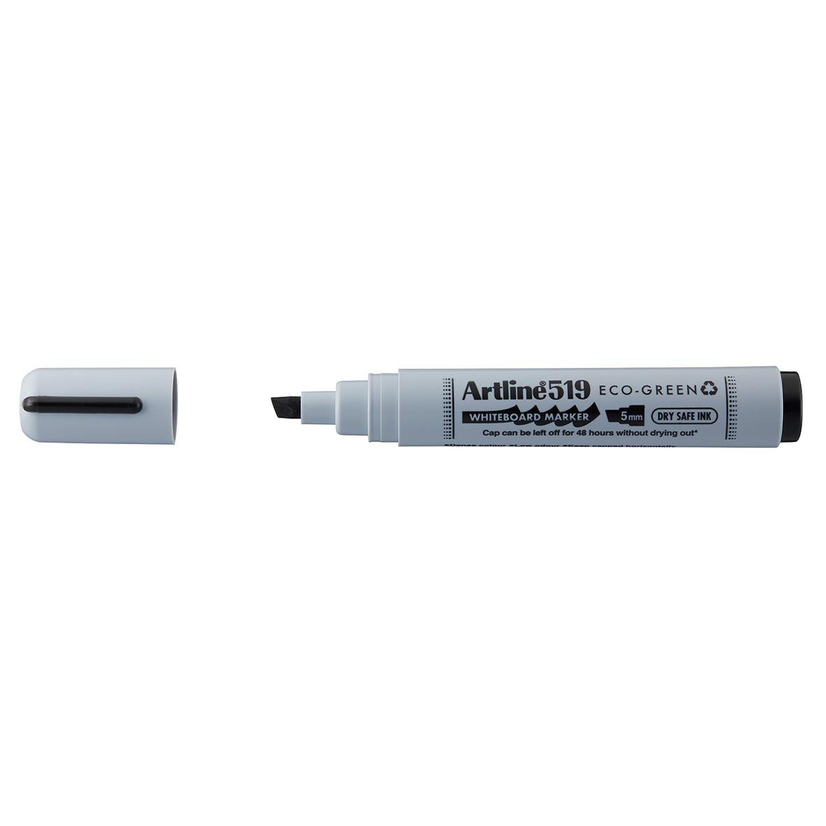 Whiteboardpenna Artline 519 ECO-GREEN Sneddskuren 4 Färger. Whiteboard-penna med skuren spets och 2-5 mm skrivbredd. Plasthylsa i återvunnen plast, alkoholbaserat pigmenttusch utan Xylen, Dry Safe-funktion vilket betyder att den vara utan huv i 48 timmar.
