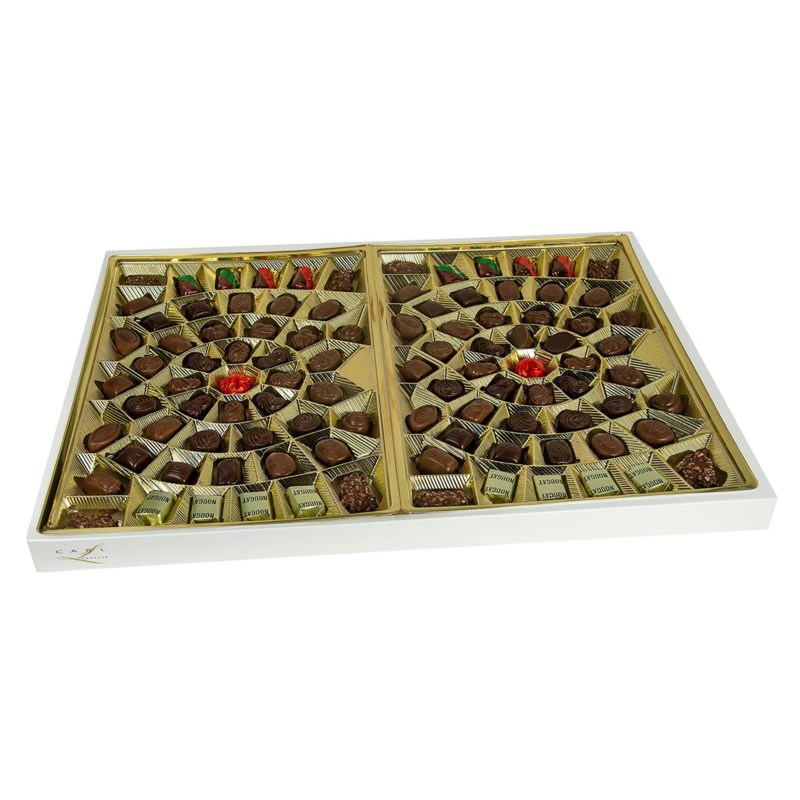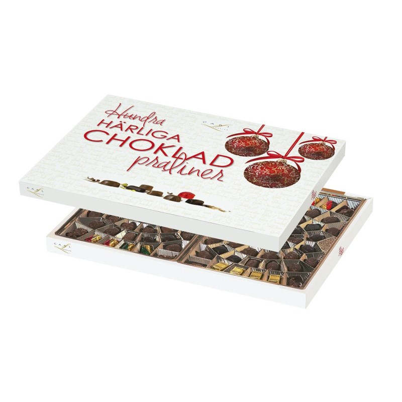 En ask fylld med 100 härliga praliner; gräddtryffel, kanelpraliner, mandelnougat m fl. Mixad sortering med mörk- och mjölkchoklad.