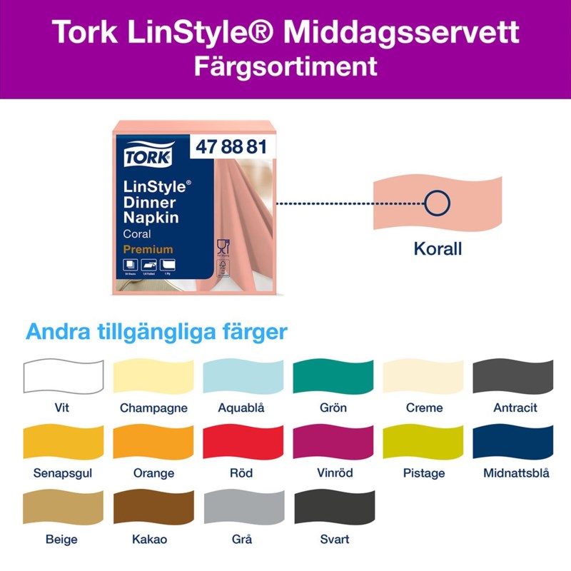 "Tork LinStyle® Middagsservett: Gör ett gott första intryck i din fullbetjäningsrestaurang med högkvalitativa Tork LinStyle® Middagsservett. Dessa restaurangservetter ger ett lyft till middagsupplevelsen eftersom de både ser ut och känns som premiumlinne.