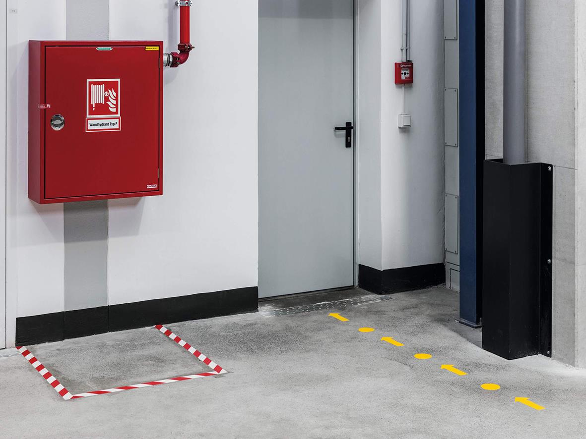 Självhäftande rund golvmärkningssymbol i form av ett "O" för markering eller avgränsning inomhus av pallplatser eller andra områden. Fäster på rena och torra betonggolv. Slitstarka och tåliga med halkskyddsgrad R9 i enlighet med DIN 51130. Mått (B x H x D