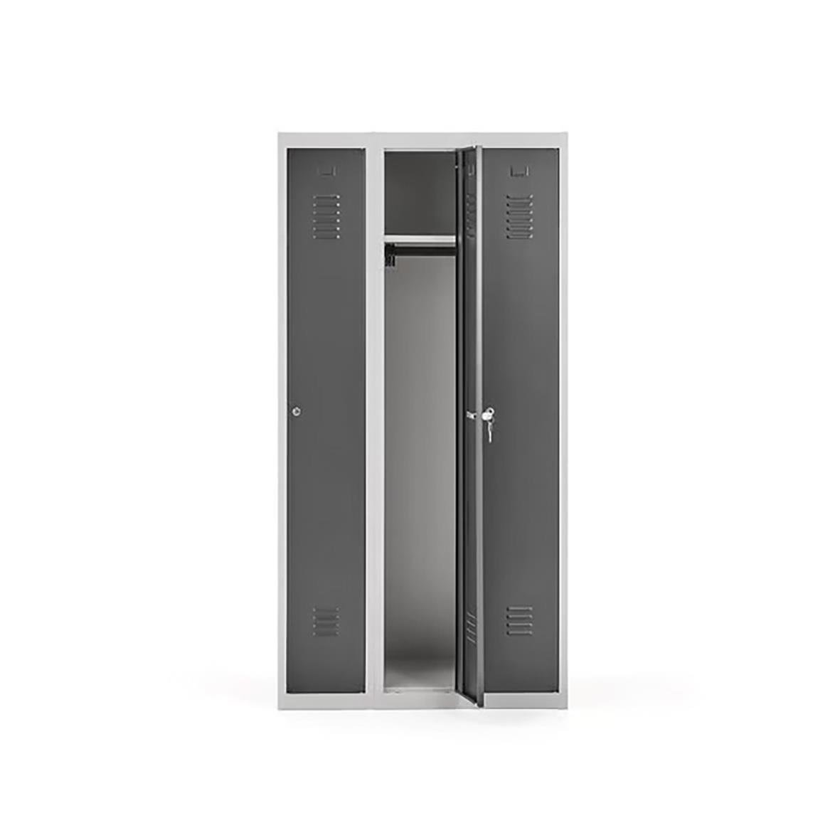 Enkelt men mycket prisvärt och praktiskt klädskåp med strukturlackerad heldörr och stomme av pulverlackerad plåt. Pulverlackeringen ger en stryktålig yta som klarar tufft slitage – perfekt för offentliga platser! Skåpet är försett med hatthylla och kläds