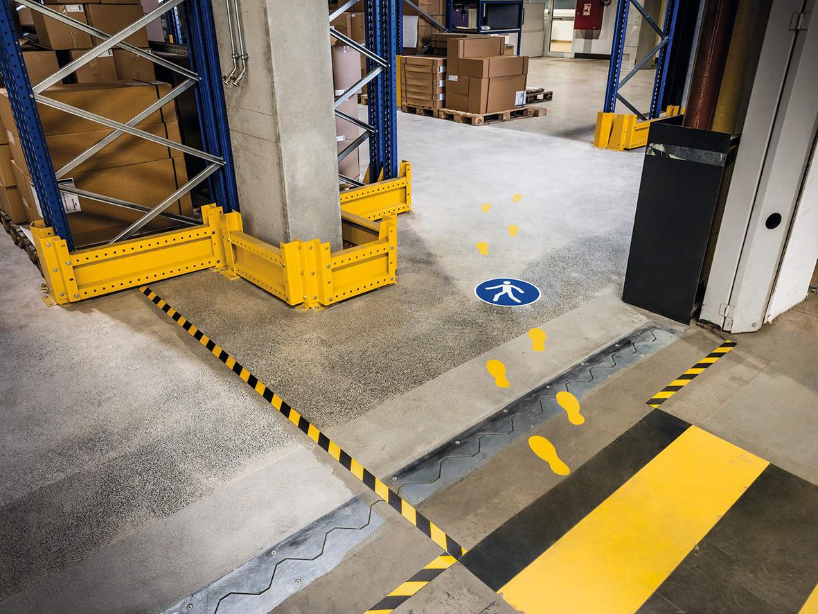 Självhäftande stor golvdekal "För gående" upplyser tydligt besökare och personal var det är lämpligt och önskvärt att gå för att ökad säkerhet och minskad risk för olyckor. Fäster på rena och torra betonggolv. Slitstark och tålig med halkskyddsgrad R9