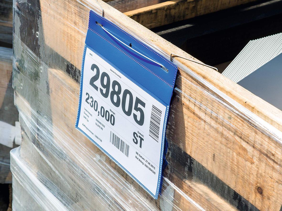 Tydlig och översiktlig märkning av containrar, pallkragar, pallkartonger och väggar av nätgaller förbättrar och effektiviserar arbetsprocessen på lager och i produktionsanläggningar. Plastfickorna av slitstark polypropylene går att läsa med skanner. Ett