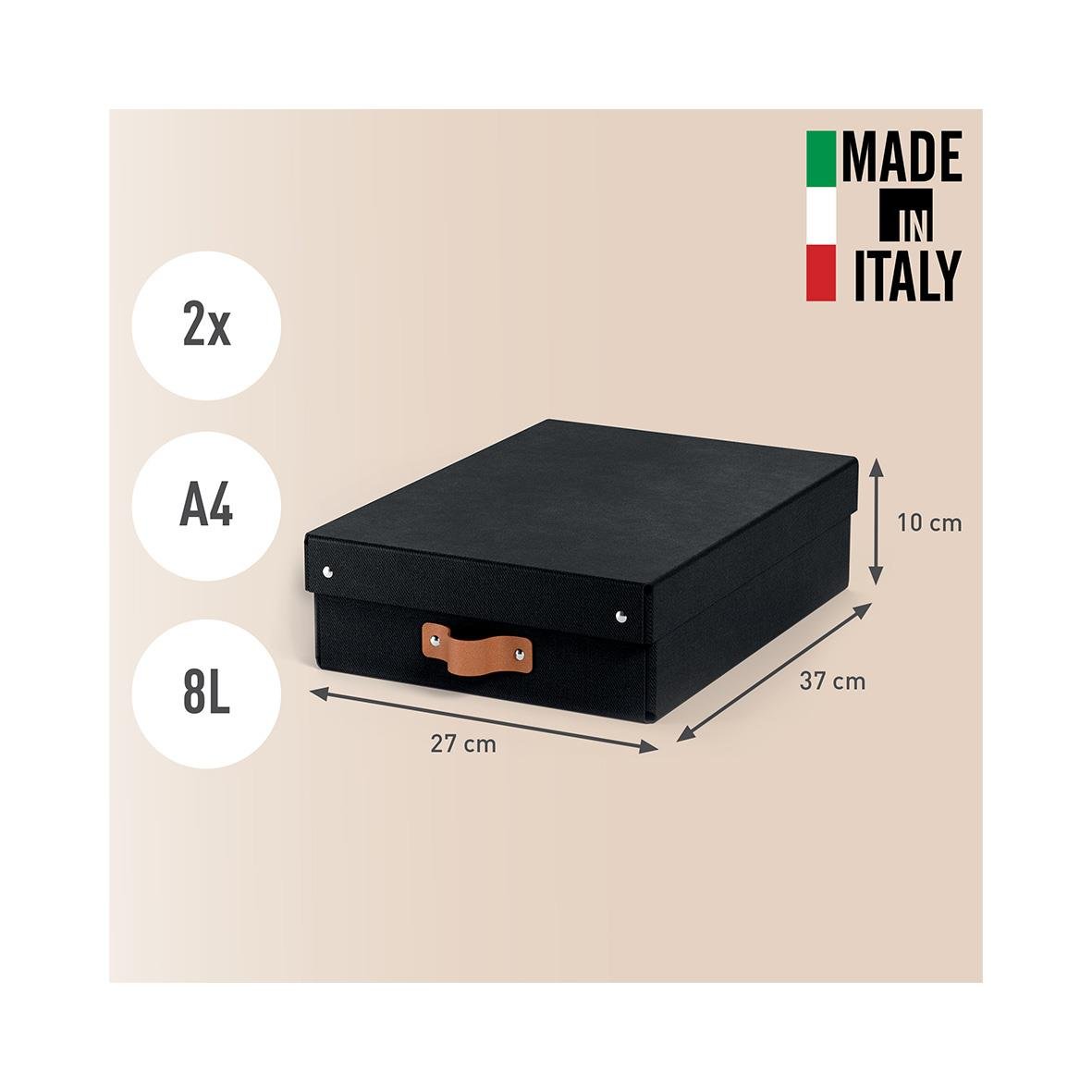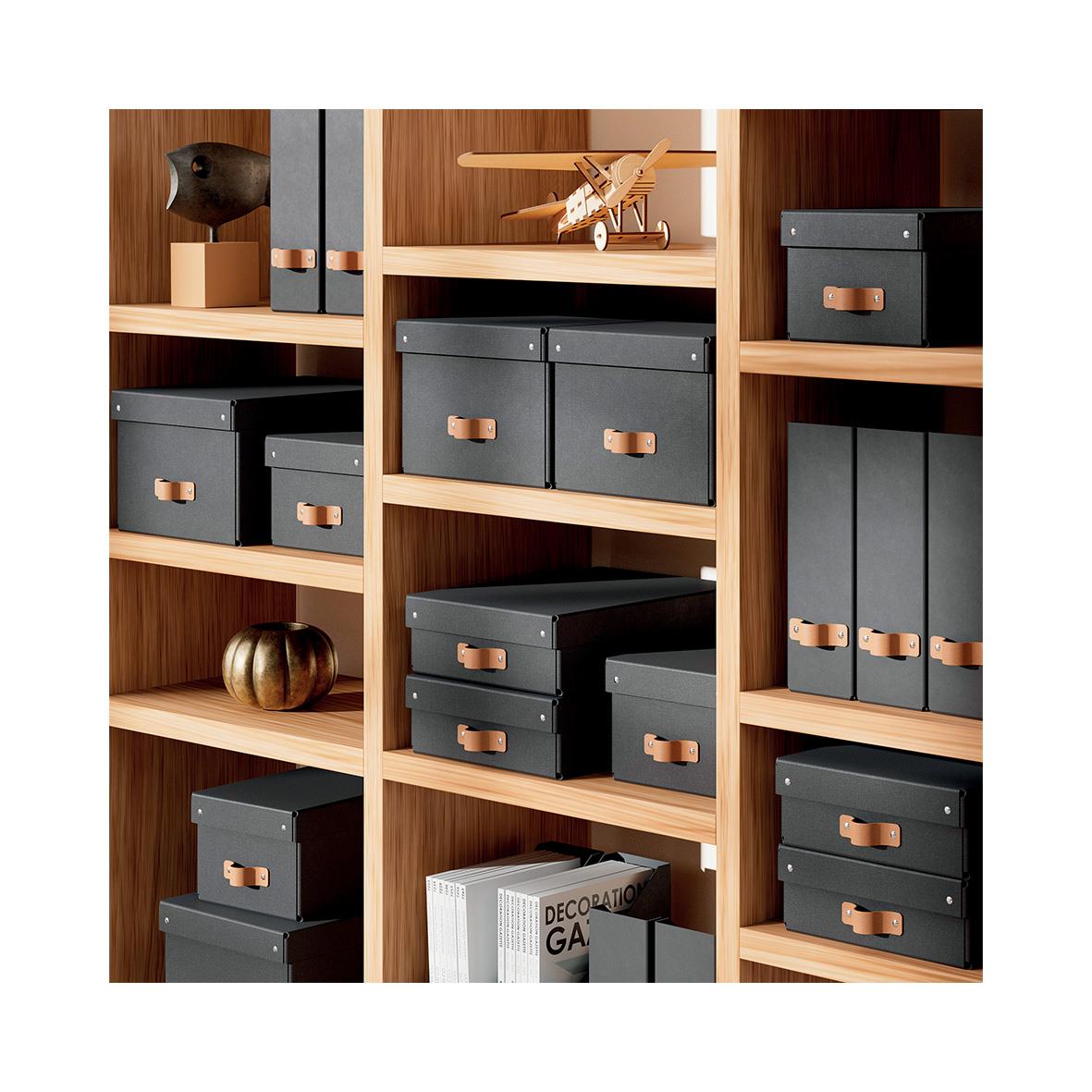 Set med två förvaringslådor i svart med låg höjd och lock tillverkade av 100% återvunnen FSC-certifierad kartong i en modern och stilren design som passar både hem och kontor. Mångsidig förvaring med en kapacitet på 8 liter, perfekt för A4-dokument, 14-tu