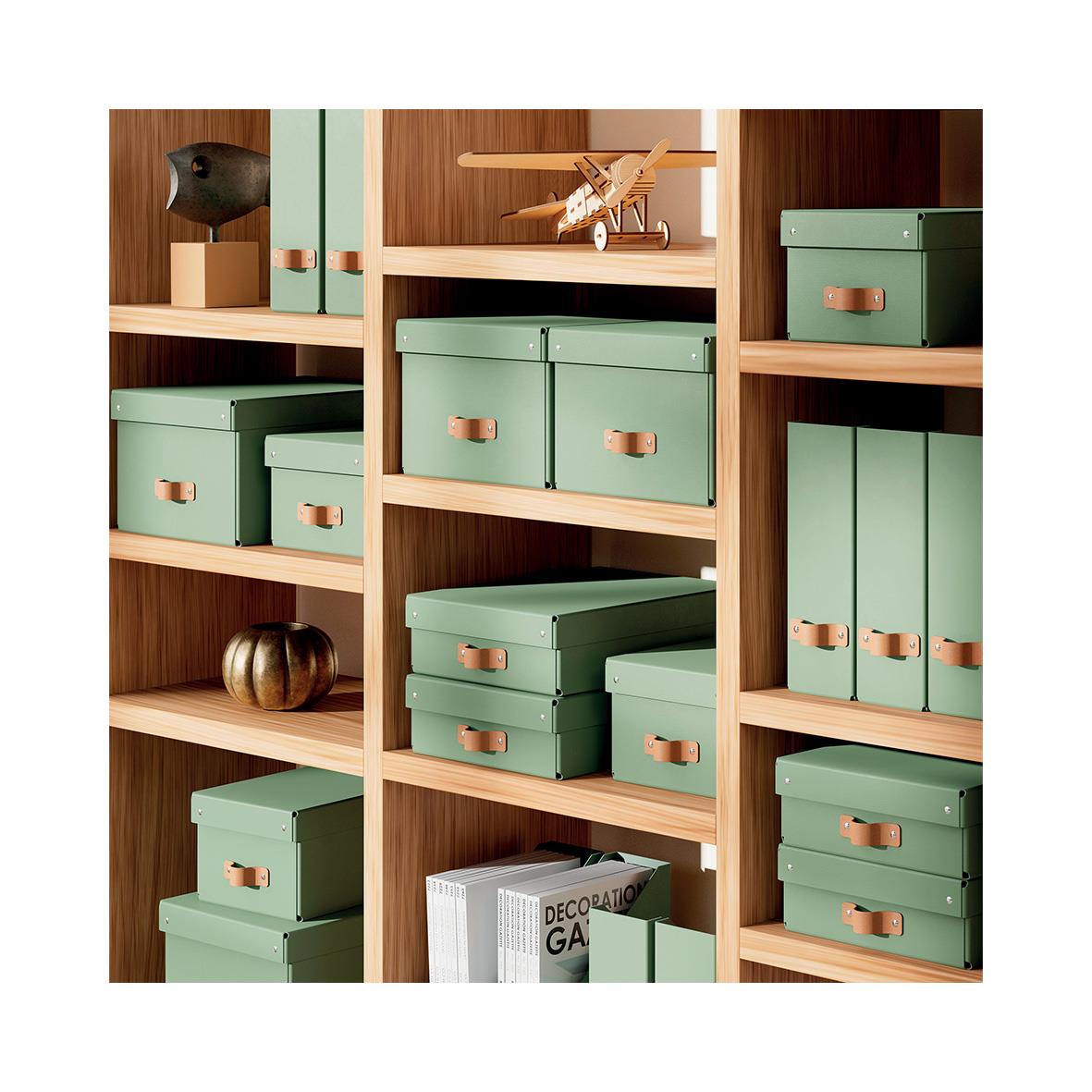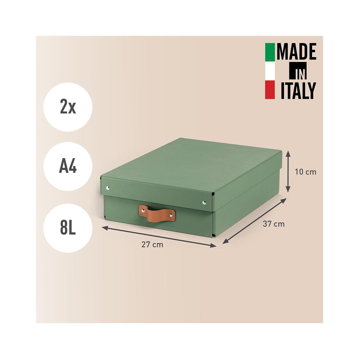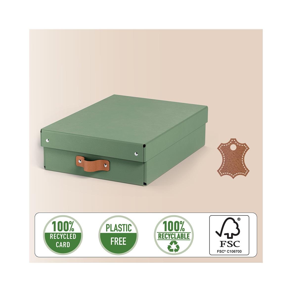 Set med två förvaringslådor i grönt med låg höjd och lock tillverkade av 100% återvunnen FSC-certifierad kartong i en modern och stilren design som passar både hem och kontor. Mångsidig förvaring med en kapacitet på 8 liter, perfekt för A4-dokument, 14-tu