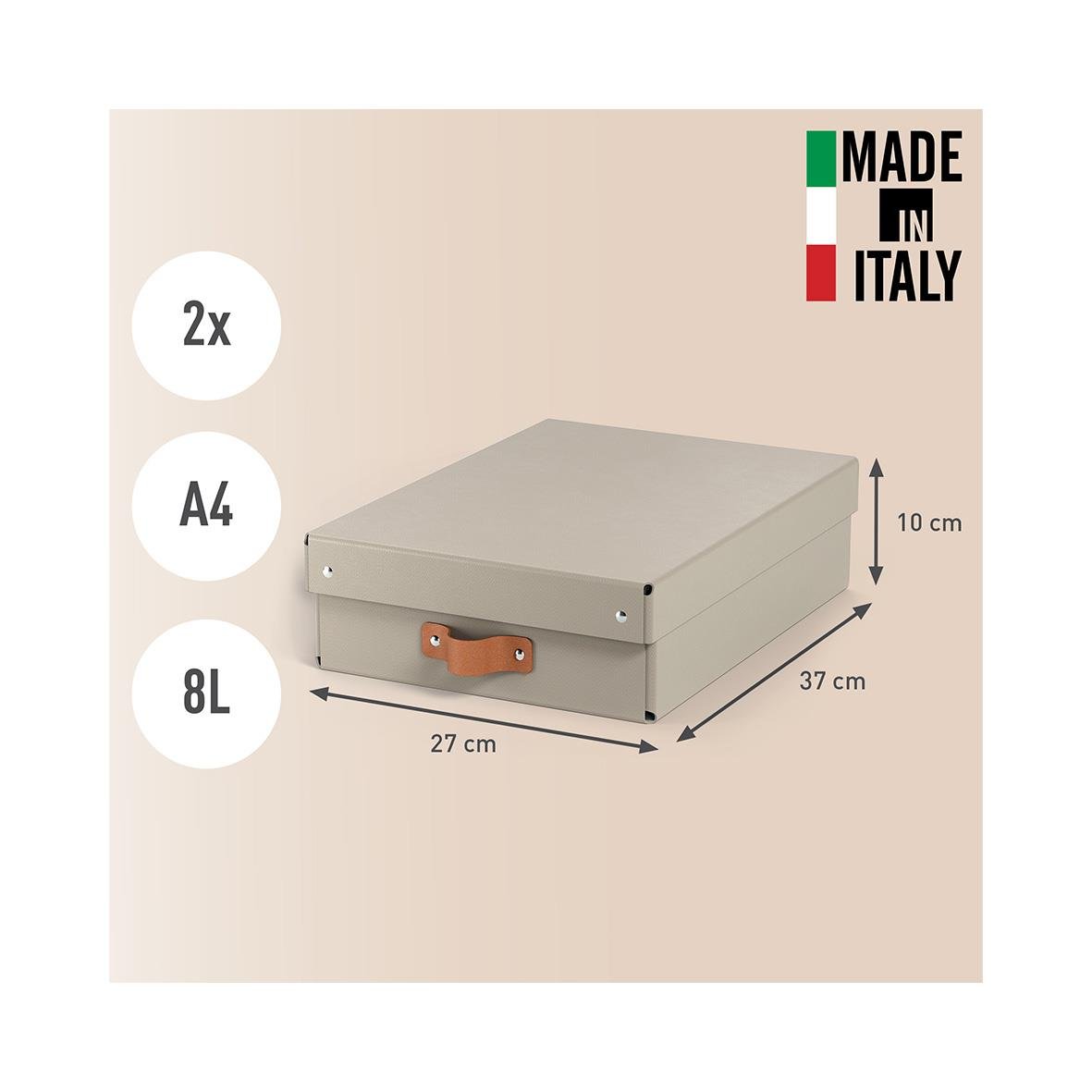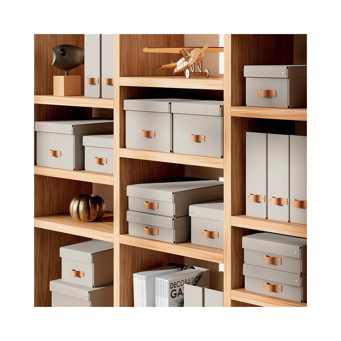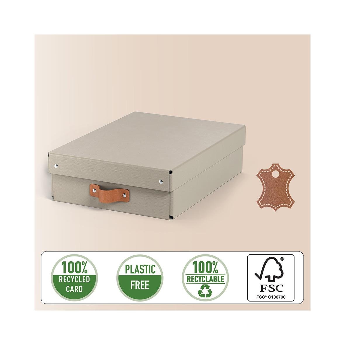 Set med två förvaringslådor i beige med låg höjd och lock tillverkade av 100% återvunnen FSC-certifierad kartong i en modern och stilren design som passar både hem och kontor. Mångsidig förvaring med en kapacitet på 8 liter, perfekt för A4-dokument, 14-tu