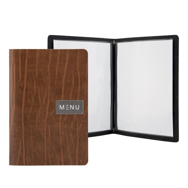 Skapa en lyxig känsla i din restaurang, bar eller hotell med Securit A5 menypärm. Den här menypärmen är flexibel och lätt att rengöra. En tryckt metallplatta med ordet "Menu", en tom metallplatta och en dubbelsidig plastficka för 4 x A5-sidor ingår. Menyp