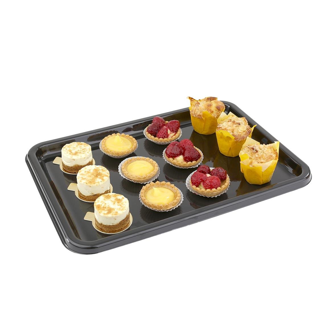 Uppläggningsfat rPet Svart 35x24x2 cm. Snyggt och praktiskt uppläggningsfat som passar perfekt för catering och uppläggningar av en mängd olika produkter. • Godkänt för kontakt med livsmedel • Temp -20 till + 70°C • Microvågsugnsäker: Nej