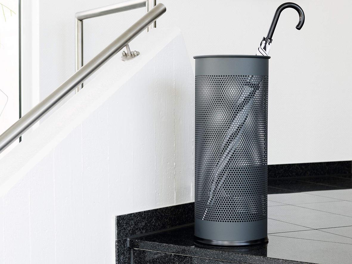 Använd detta stilrena paraplyställ t ex i entreér till olika mottagningar, bibliotek, hotell, receptioner, restaruanger eller hemma. Reptålig ytbeläggning. Med antiglidskydd på undersidan. Kan även användas som papperskorg. Rymmer 28,5 liter. Mått: Ø 260