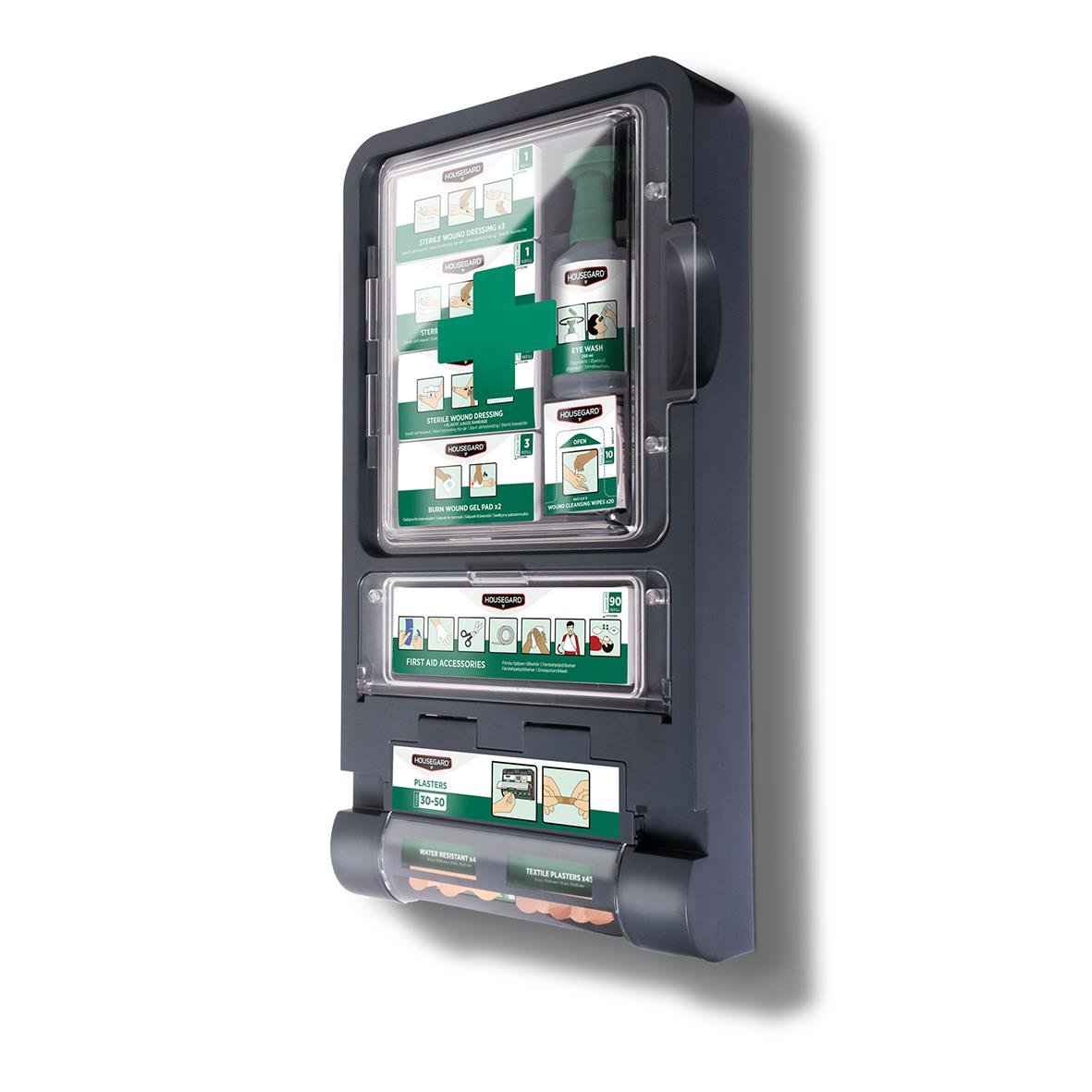Första hjälpen-station för sårvård och ögonskölj som samlar utrustning för första insats i arbetsmiljöer där det krävs ordning och överblick. Stationen är anpassad för verksamheter där regelbunden kontroll och påfyllning ingår i det systematiska arbetsmil