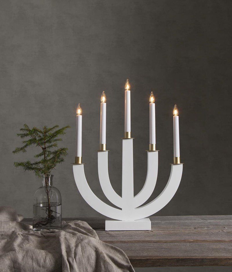 Träljusstake med 5 ljuskällor och guldmålad dekoration. Lätt att placera och skapar en härlig julstämning både i fönster och inne i rummet på t ex en hylla eller skänk. Sladd 1,8 m. Mått B x H x D: 37 x 47 x 8 cm. Vit.