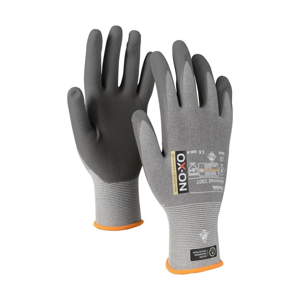Montagehandske OX-ON 1907 Flexible Advanced 11 OX-ON Flexible Advanced 1907 är den tunnaste handsken i klassen, men fortfarande av högsta kvalitet och även ESD-godkänd och med touch-funktion. Handsken är extremt slitstark och sitter som gjuten på handen.