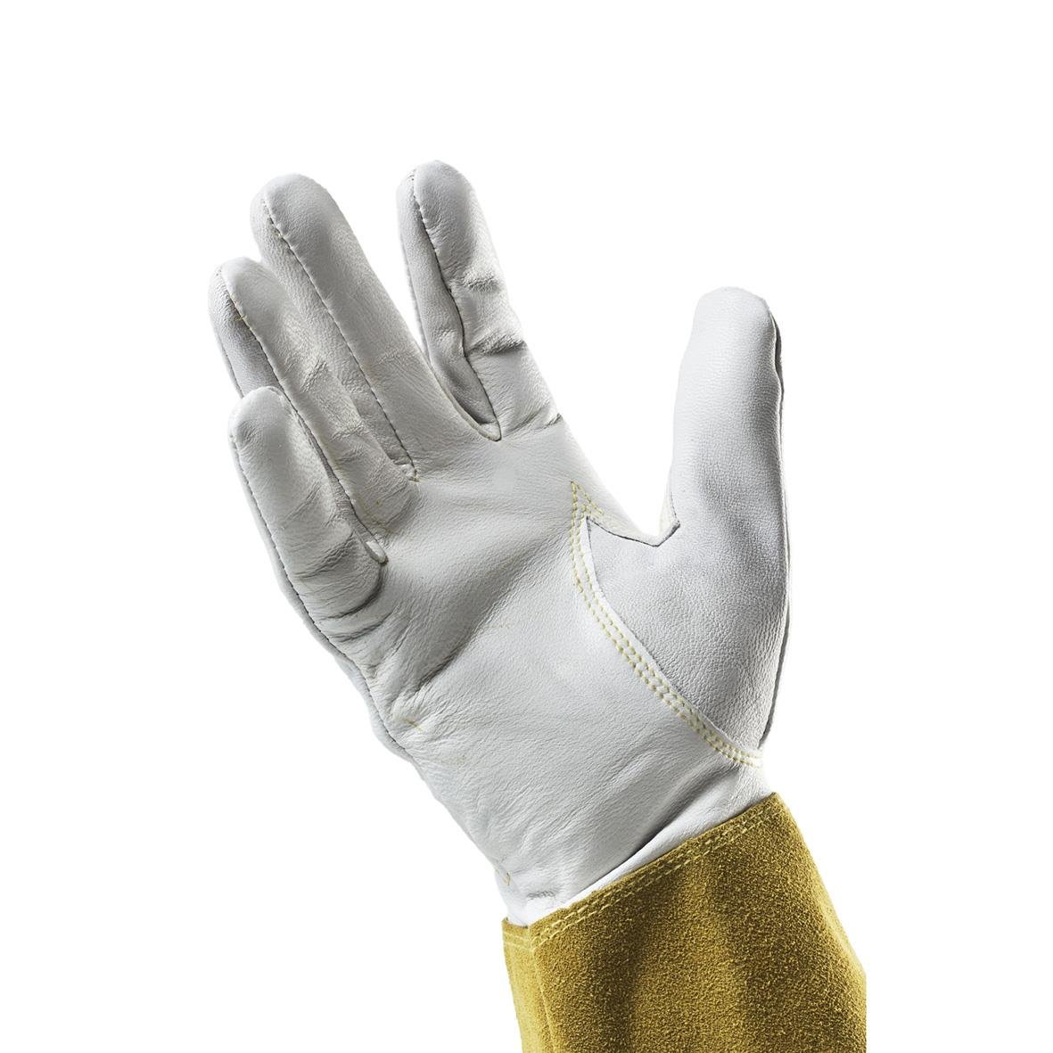 Läderhandske Tegera 126A 10. Högkvalitativ läderhandske med utmärkt komfort, flexibilitet och sömmar i Kevlar®. Handsken är industristandard för TIG-svetsning. Lång manschett ger extra skydd mot stänk. Elastisk handled för bättre passform, ofodrad för ex