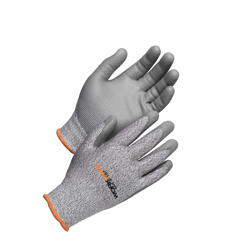 Skärskyddshandske Worksafe Cut-107 stl 11. Bekväm PU-doppad skärskyddshandske med skärskyddsnivå 3. Passar bra till arbete där skärskador kan förekomma. Ventilerande ovanhand och en stickad sömlös liner ger en skön komfort under hela arbetspasset. Lämpli