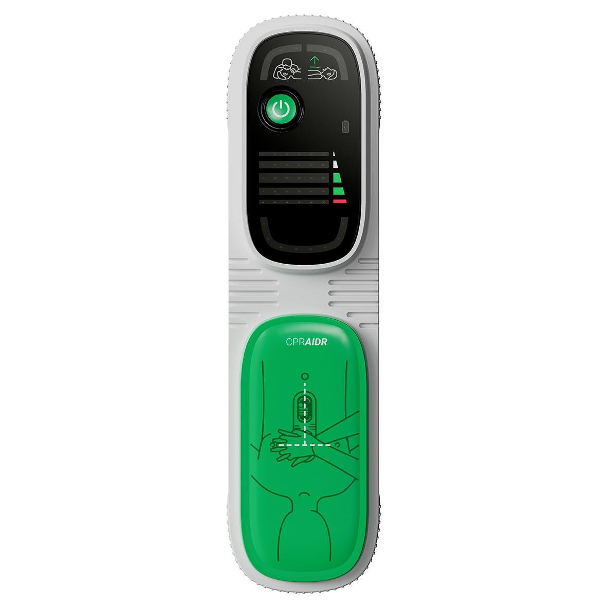 Hjärtstartare CPRAIDR Den Digitala HLR assistenten. CPRAIDR är en komplett HLR-lösning som kräver CPRAIDR-appen i mobilen. Via appen, AI-coach och utrustning med realtidsfeedback blir träningen enkel att upprepa – och samma enhet ger tydlig steg-för-steg-