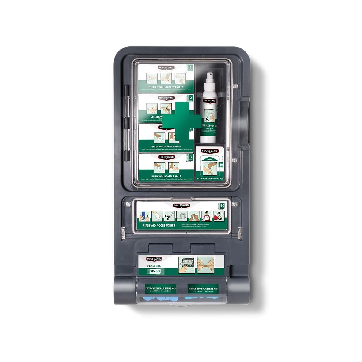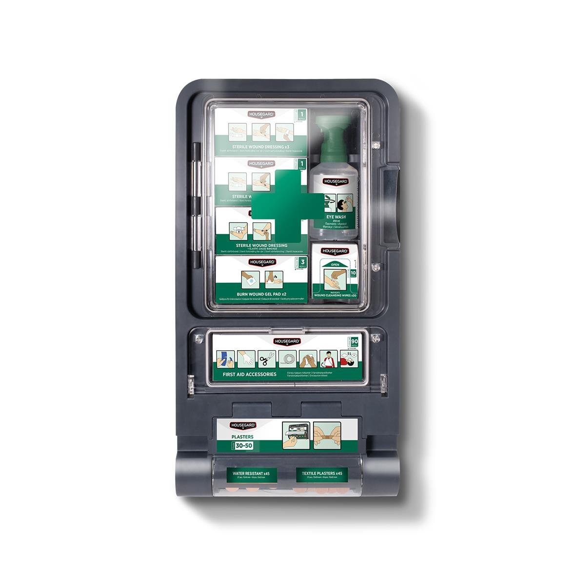 En komplett första hjälpen-station med utrustning för både sårvård och brännskador. Stationen är överskådlig och lättåtkomlig, med en lucka försedd med gummilist som skyddar mot damm, fukt och smuts.