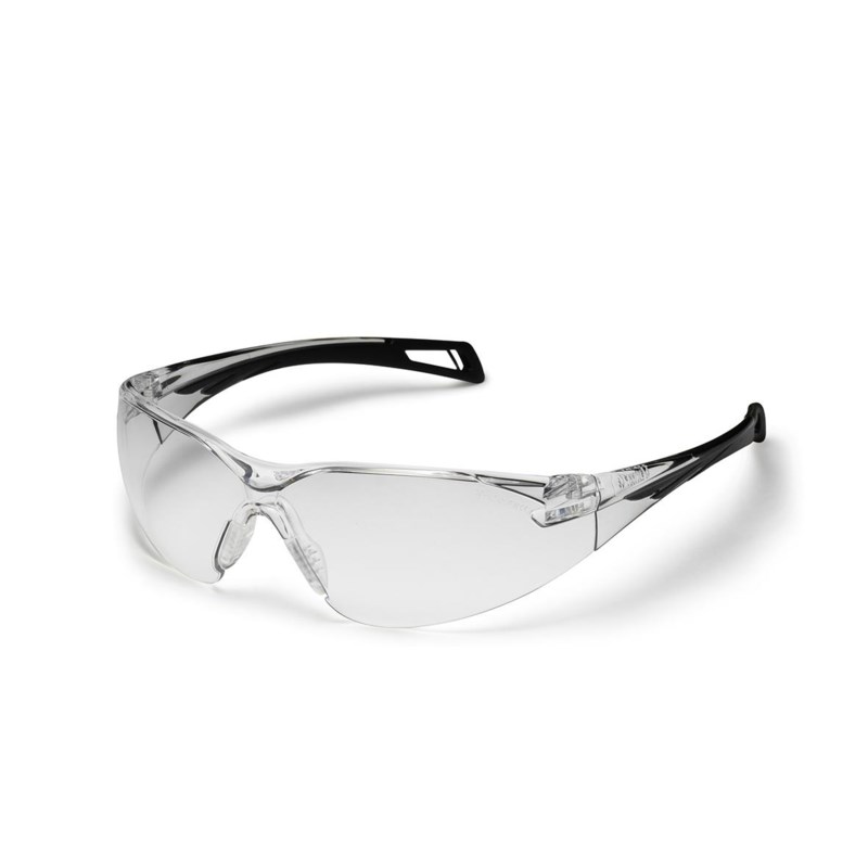 Skyddsglasögon i modern och sportig design med integrerad skalm och båge. Mycket bra passform och "örongrepp". Mjuk och justerbar näsbrygga, mjuka injektioner i glasögats skalmar som får dem att sitta bra, säkert och komfortabelt med klar imfri lins i rep