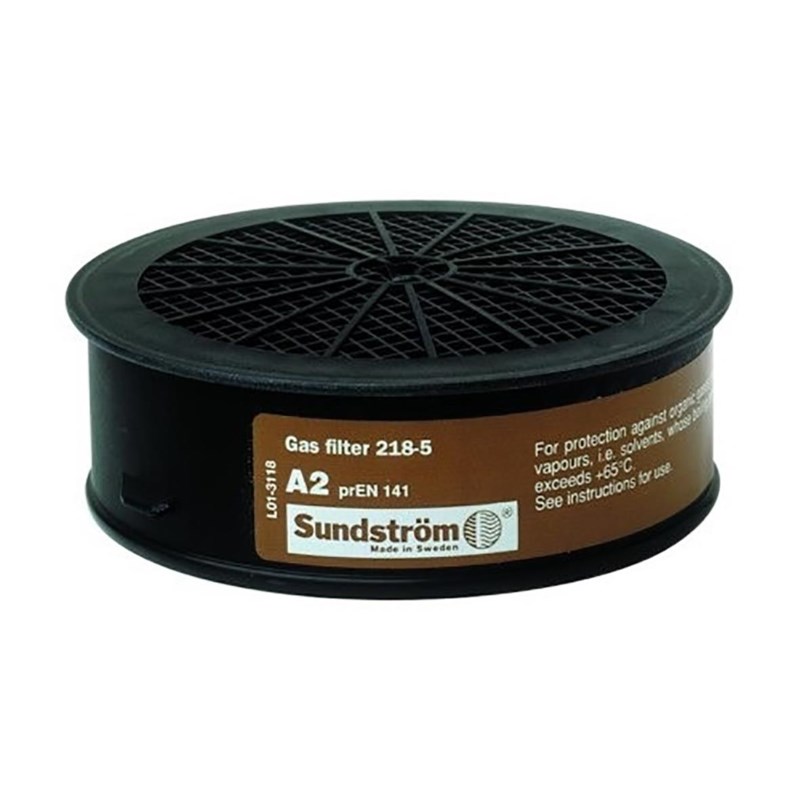 Gasfilter SR 218, klass 2 är avsedd för användning tillsammans med Sundströms halv- och helmasker. Filtret är typ A och skyddar mot organiska gaser och