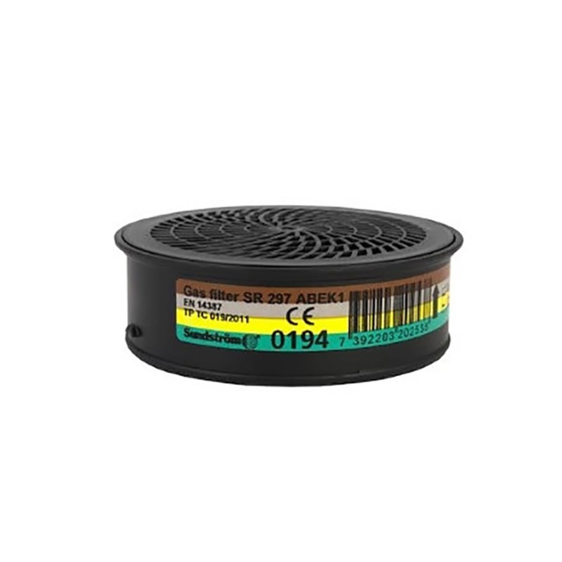 Gasfilter SR 297, klass 1, är avsett för användning tillsammans med Sundströms halv- och helmasker. Filtret är av typ ABEK och skyddar mot följande typer av gaser/ångor: Typ A skyddar mot organiska gaser och ångor, lösni