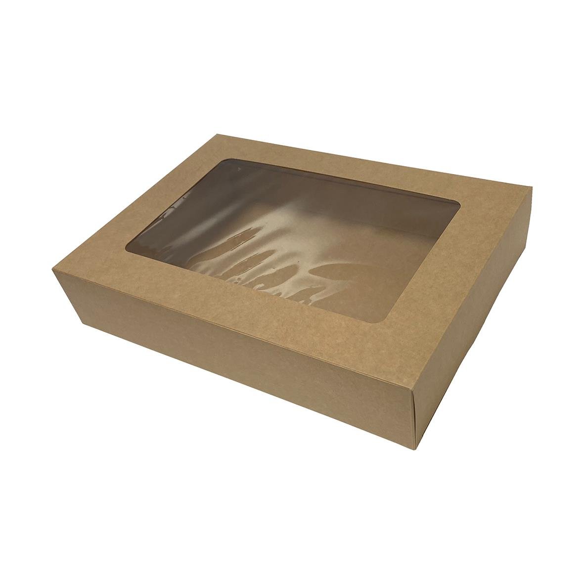 Cateringkartong Med Fönster Brun 36x26x7 cm. Material Brun kartong FSC + PET fönster. Snygg och praktiskt cateringlåda som passar perfekt för praktisk och säker transport av din catering .